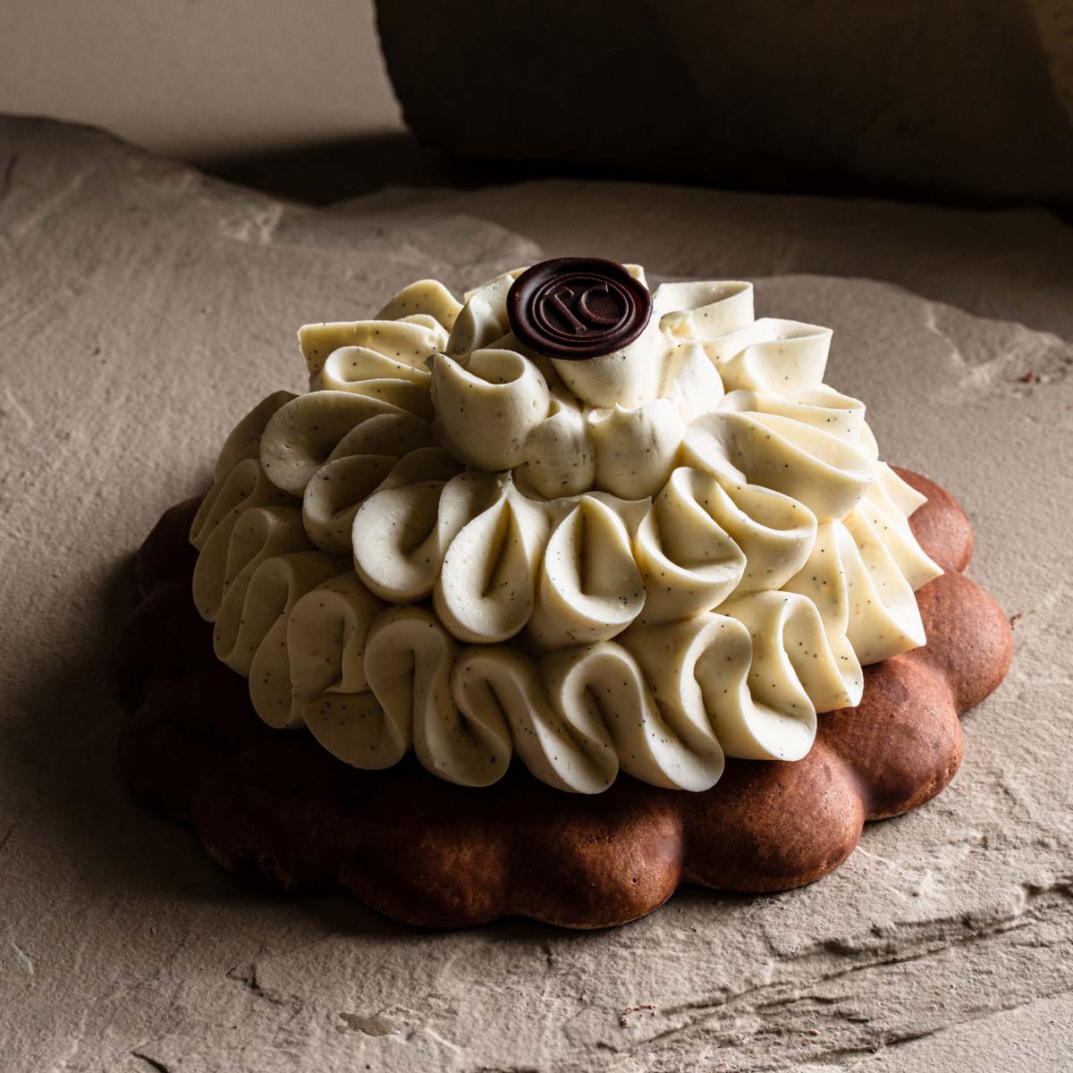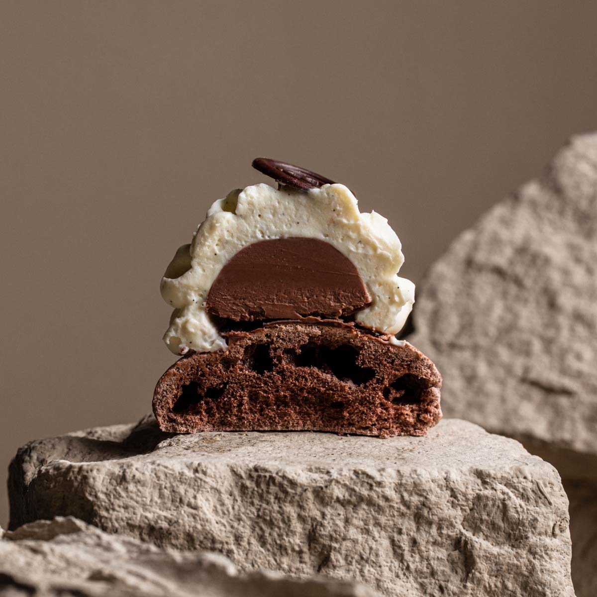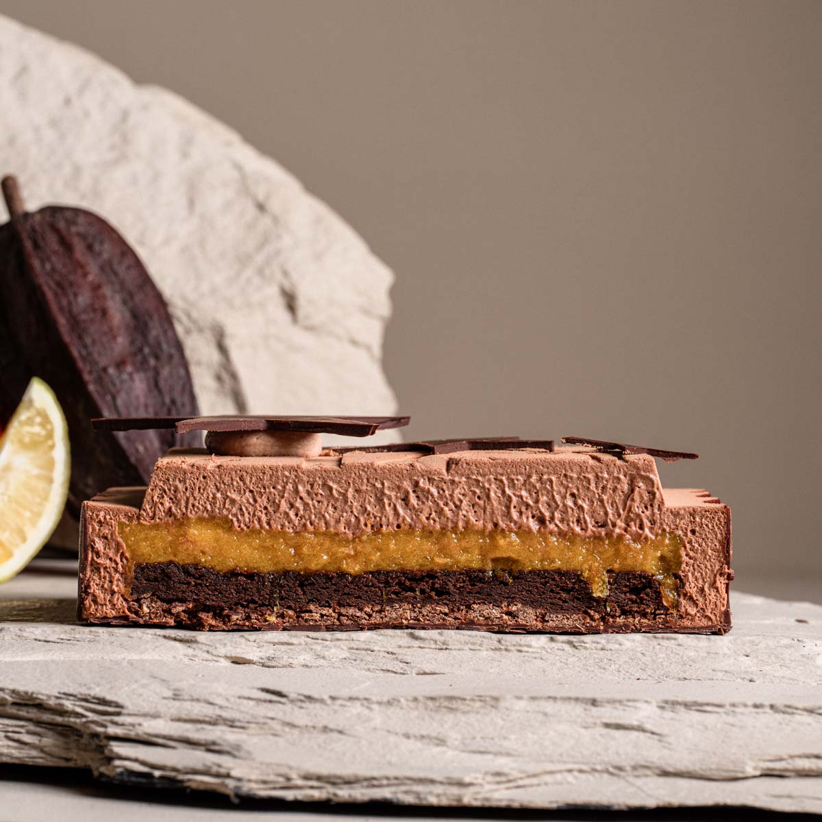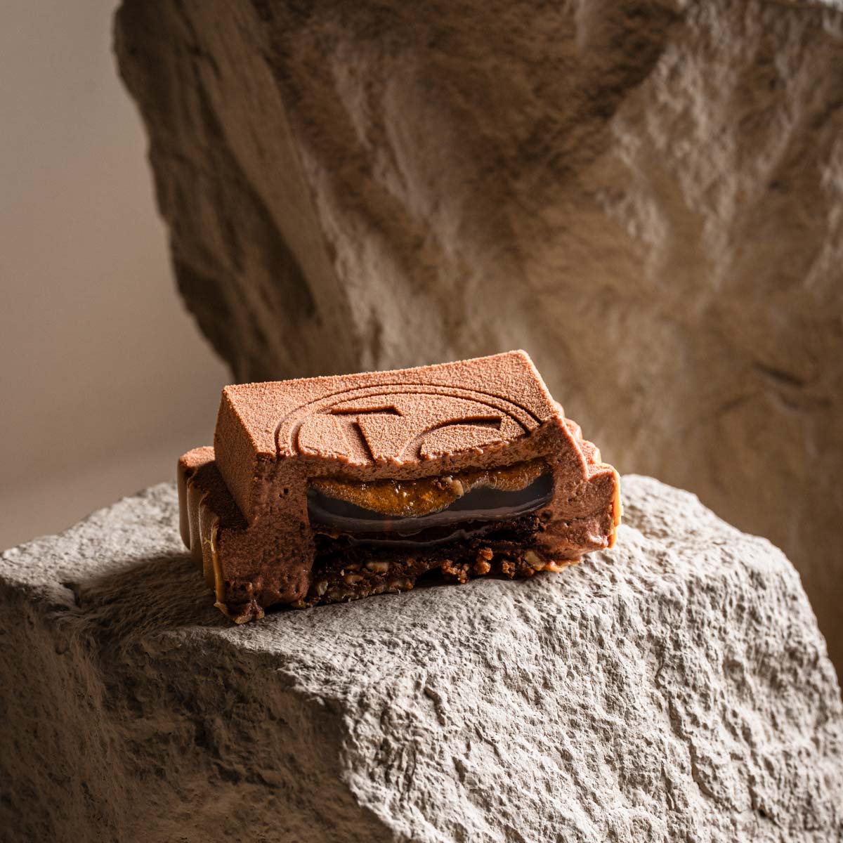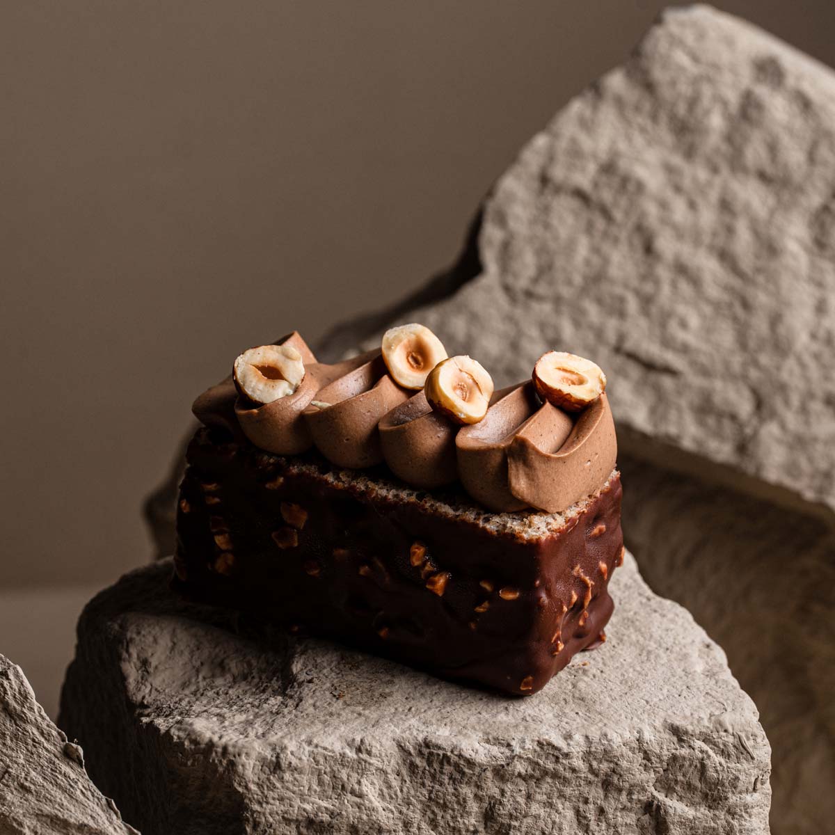 Une superposition de pâte meringuée à la noisette et d’un crémeux gianduja, le tout enrobé de chocolat noir et parsemé d’éclats de noisette. Un jeu de textures entre croquant, fondant et douceur chocolatée pour un dessert riche en saveurs et en gourmandise.