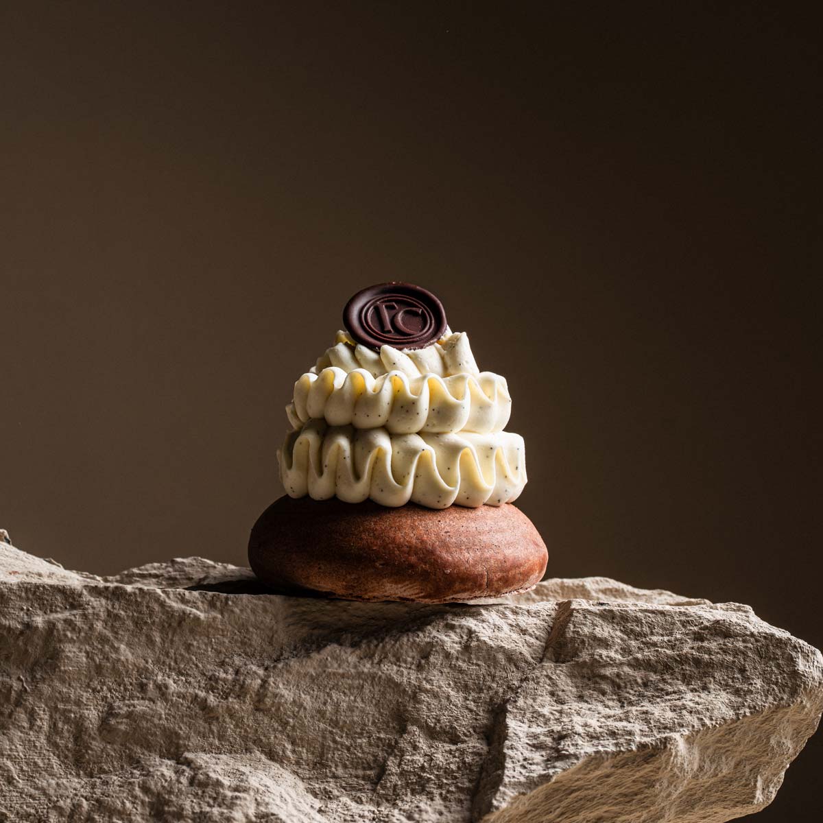 Une pâte à choux fourrée d’un praliné noisette du Piémont et de grué cacao de la maison Carrack, une combinaison unique d’arômes doux et puissants.