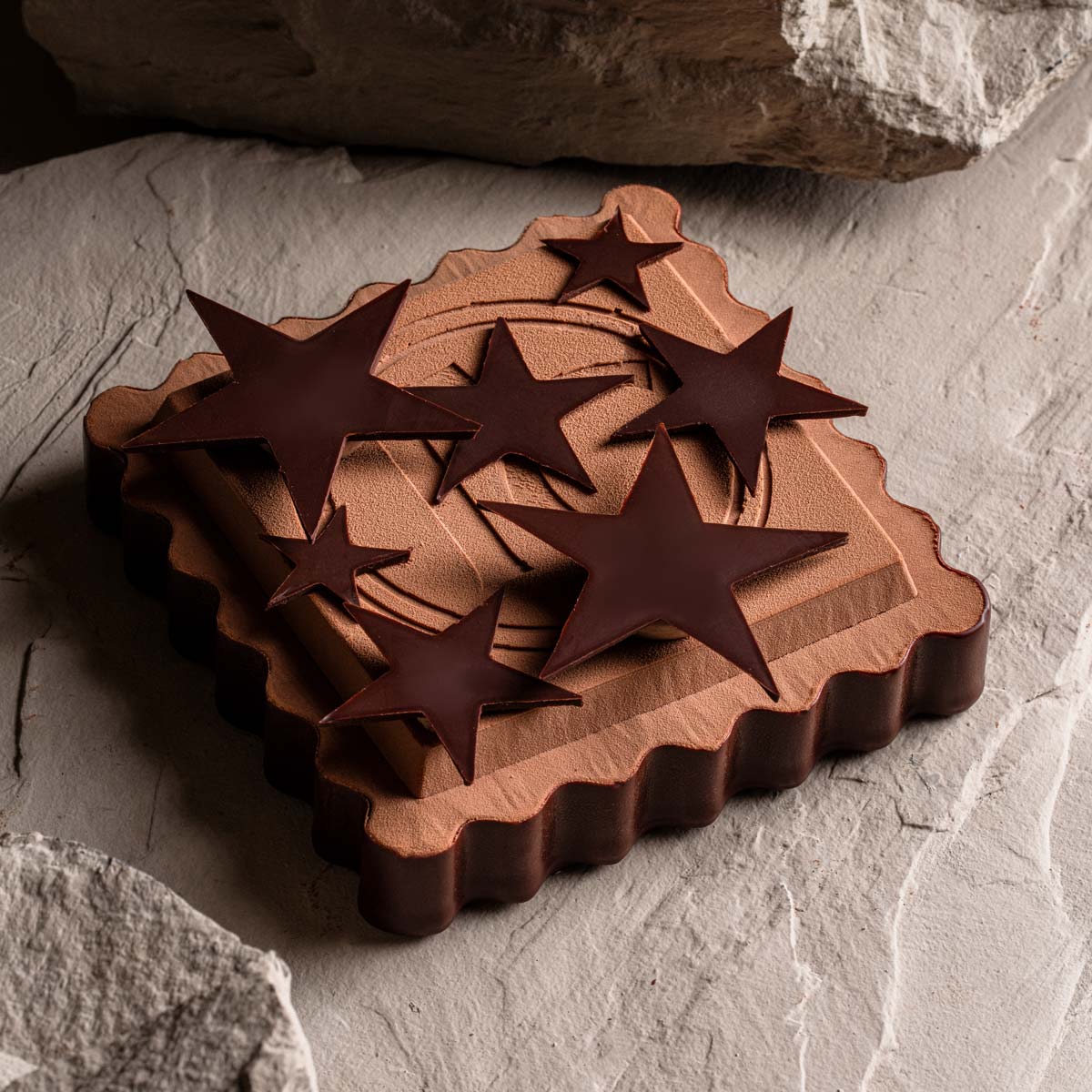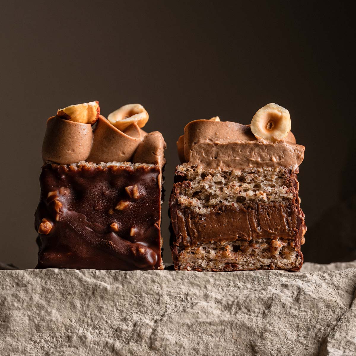 Nos biscuits signature les carrés se transforment en gâteau individuel et à partager. Plusieurs couches alternant croustillant et saveurs noisette-cacao. Croustillant noisette, biscuit Sacher, insert pulpe de cacao, praliné noisette et mousse Esterre 70%.