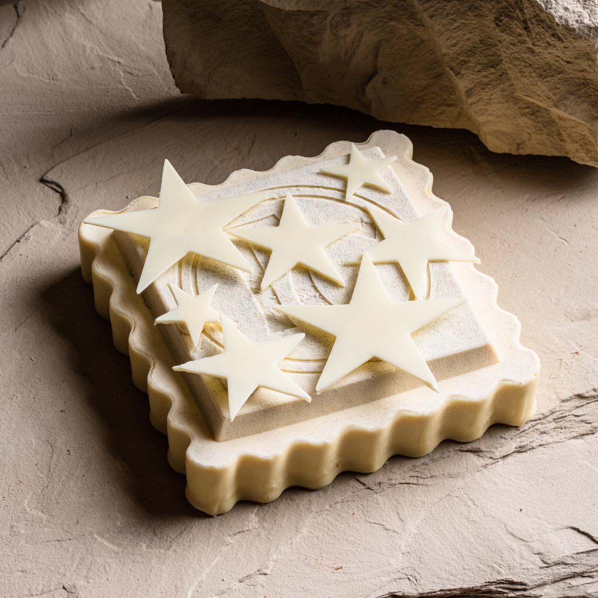 Une création inspirée par les souvenirs d’enfance nantais de Yohan Coiffard. Ce biscuit de voyage se décline sur des variétés de sablés, nature, chocolat ou pistache. Le carré de chocolat est signé Orfève.